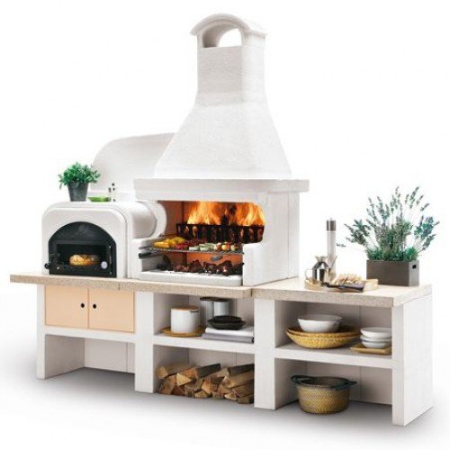 Выполнена из совместимых модулей. Столешница из полированного камня Marmotech. Основания всех модулей имеют заднюю стенку. Стальная решетка для дров и решетка из нержавеющей стали 76х40 с бакелитовыми ручками. Общие размеры: 450х85х218 cм.