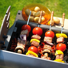 Контейнер очага чугунный, с центральной перегородкой, экономный и практичный, перегородка позволяет раздельное использование отсеков контейнера, легко перемещаемая тележка, рабочая доска с передней стороны, регулирование решетки по высоте, несколько положений для вертела, двигатель и вертел в комплекте поставки.