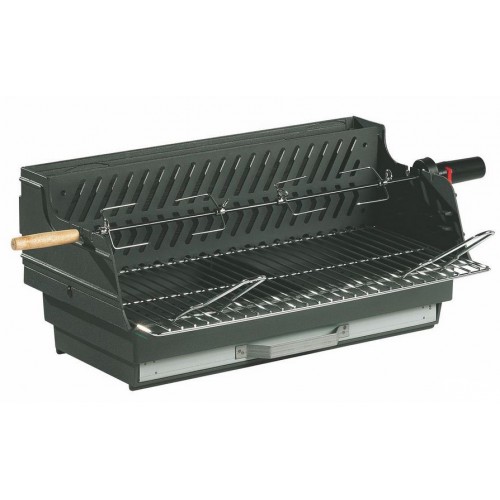 Эксклюзивный аппарат с разделенным контейнером очага, большой зольный ящик, регулируемая по высоте решетка, несколько положений для вертела, чугунная колосниковая решетка поддерживает древесный уголь, при работе в режиме жаровни древесный уголь нагревает излучением и предупреждает воспламенение жиров.