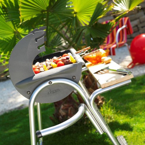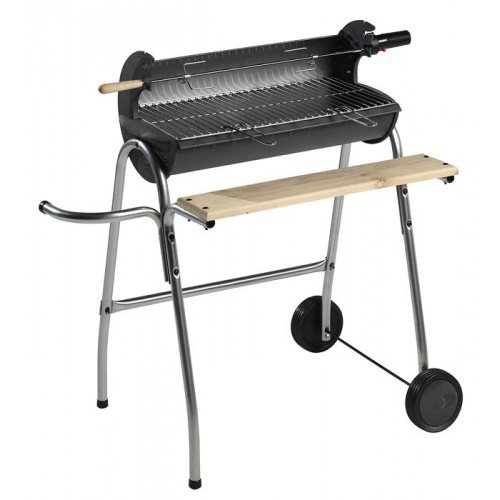 Контейнер очага чугунный, с гнездами для шампуров, удобный и функциональный, ручка для удобства перемещения тележки, рабочая доска с передней стороны, распределитель воздуха, регулирование решетки по высоте, несколько положений для вертела, двигатель и вертел в комплекте поставки, ветрозащитный экран из нерж. стали.