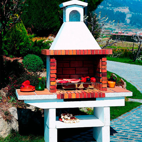 Барбекю из конгломерата, плиты из греса. Топка и консоль из огнеупорного кирпича, зольник с решеткой, решетка для жарки с направляющими. Короб и колпак из конгломерата белого цвета. Размер топки 70х58.