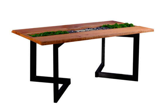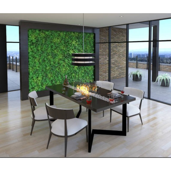 Обеденный стол Island- настоящий уголок природы в мегаполисе. Столешницу из слэбов вишни украшает не только танцующее пламя и мраморная крошка, но и стабилизированный зеленый мох. Растительный декор не требует почвы и полива, поэтому настольный ландшафт не требует ухода. За природным столом комфортно разместятся 6 человек. Декор закрыт закаленным стеклом. При желании зелень легко снять, оставив для украшения только декоративные камни.