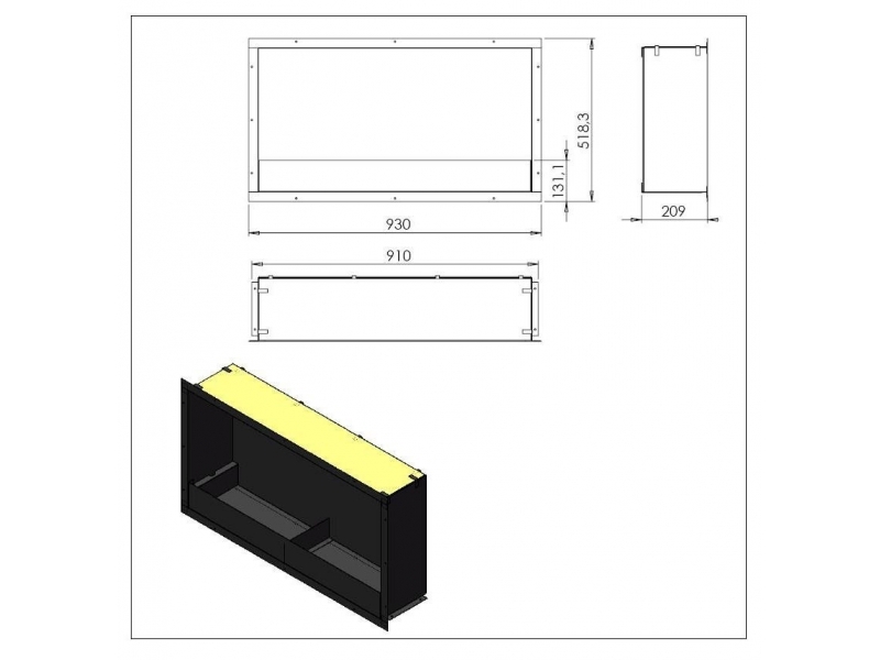Вставка для очага биокамина состоит из металлической коробки (схема прилагается ) и 2 мини топливных блока RUBY чёрного цвета.