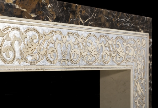 Лаконичный камин с роскошным флористическим орнаментом, созданным на основе классических древнеегипетских мотивов. Здесь можно увидеть традиционное переплетение стилизованных цветков лотоса и папируса с волютами — изысканными и замысловатыми завитками, направленными в разные стороны.