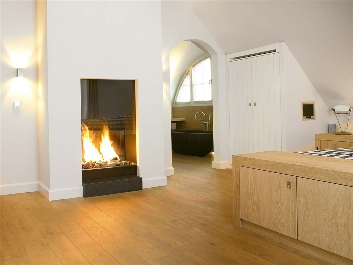 - Открытая каминная топка. Прочный экран из дымчатого темного стекла закрывает камин только частично, позволяя теплу свободно циркулировать в помещении, и одновременно выполняет защитную функцию.