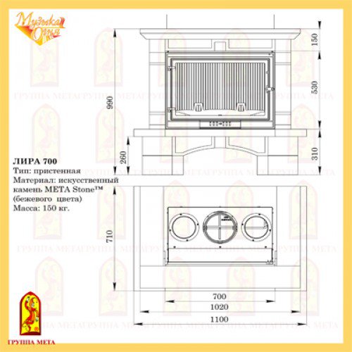 Каминная облицовка Лира 700 изготовлена из камня META Stone™ (бежевого цвета). Вставки в боковые панели выполнены из пеноблока и подготовлены для последующей отделки (может использоваться любая отделка, толщина материала не более 30 мм). Отделочный материал в комплект не входит.