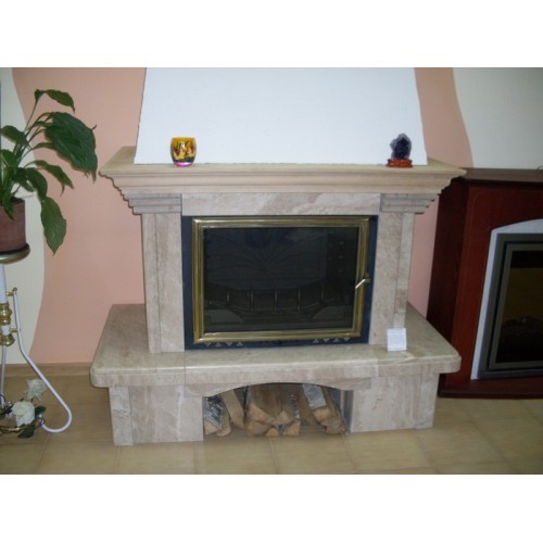 Классический камин в универсальном стиле, из полированного мрамора - Breccia. Балка из дуба. Совместим с топками 700 и 750 серии с прямым стеклом