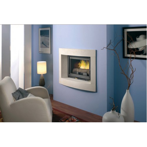 Каминная рамка выполнена из светлого камня Estallaides. Адаптируемая топка с прямым стеклом.
