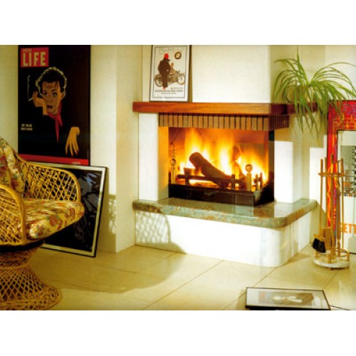 Угловой камин из бучардированного мрамора Becco. Плита из полированного гранита Frondo. Консоль из огнеупорного кирпича толщиной 3 см. Металлическая топка 071, открытая сбоку, зольник и колосник.