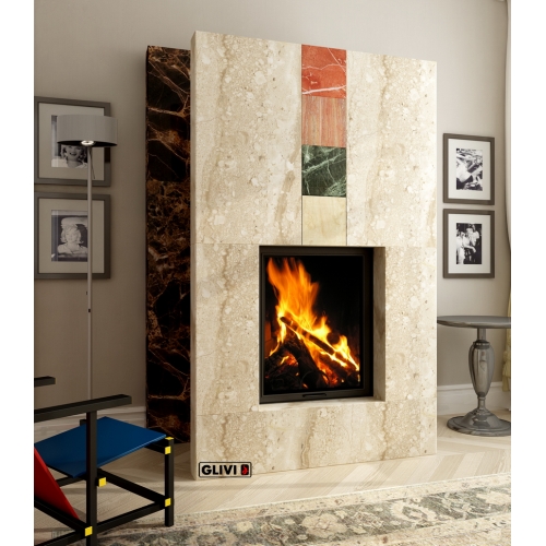 - Камин выполнен из полированного мрамора Emperador Dark, Breccia Sardo, Rojo Levante, Rain Forest Green, Giallo Rena; из травертина Rosso Persiano.