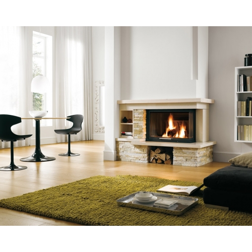 Камин Palazzetti Liverpool изготовлен из жёлтого кварцита или белый колотого камня (по выбору), верхняя и нижняя панели выполненны из белого полированного мрамора. Полки выполненны из осветлённой сосны.