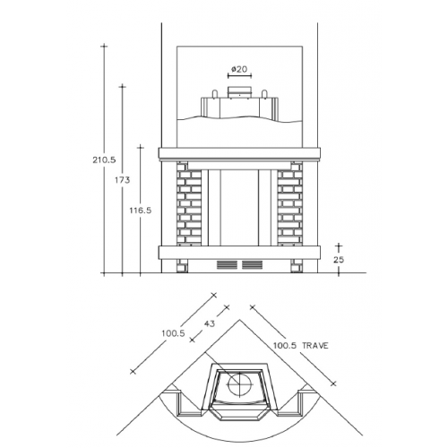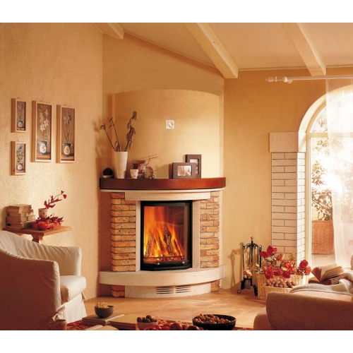 Полукруглая форма данной модели идеально украсит любой угол в комнате. Бока камина выложены из кирпичиков, которые изготовлены из мрамора. Декоративная балка вокруг камина служит небольшой полочкой. Для доступа воздуха предусмотрены отверстия в нижней части камина. В верхней части камина находятся отверстия для теплого воздуха, который можно регулировать при помощи переключателя.