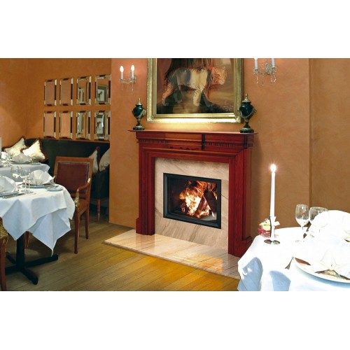 Cтыковка деревянной облицовки с топкой осуществляется с помощью готовых технологических решений. Данная модель - дуб, мрамор Daino Reale. Возможен выбор сортов дерева и мрамора. Параметры: Высота 122 см Ширина 144 см Глубина 20 см