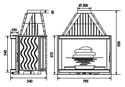 Каминная топка с очагом, облицованным специальным огнеупорным камнем. Топка оснащена регулятором тяги, который автоматически открывается в момент поднятия дверцы. Съемные и поворачивающиеся задвижки, через которые поступает воздух. Выдвижной зольник. Съемные ножки.