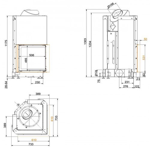 Угловая каминная топка с цельным Г-образным стеклом. Дверца с подъемным механизмом (система Easy-Lift). Топочная камера футерована шамотом. Ширина дверки 506/506 мм, высота - 485 мм. Возможно подключение воздуха из-вне.