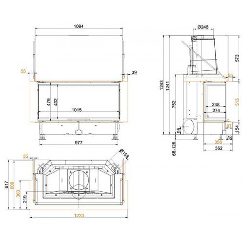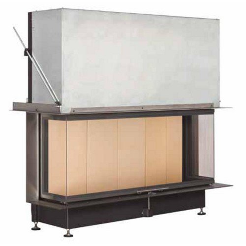 Трёхсторонняя каминная топка. Топочная камера футерована шамотом. Подъёмный механизм двери (система Easy-Lift). Ширина дверки 248/1015/248 мм, высота - 479 мм. Возможно подключение воздуха из-вне.