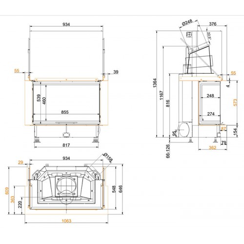 Трёхсторонняя каминная топка. Топочная камера футерована шамотом. Подъёмный механизм двери (система Easy-Lift). Ширина дверки 248/855/248 мм, высота - 492 мм. Возможно подключение воздуха из-вне.
