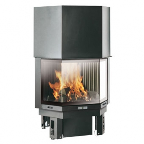Закрытая топка с металлическим корпусом темно-серого цвета. Эркерная дверца с подъемным механизмом двух видов: