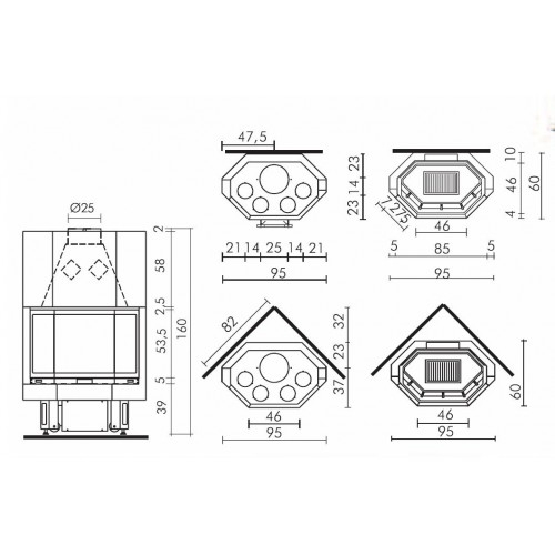 Предусмотрены 4 отверстия для подсоединения набора для разводки горячего воздуха. Топка укомплектована системой двойного дожига.
