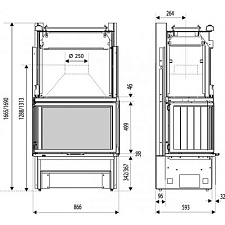 Термостойкость стекла до 800 гр Ц., в зависимости от модели топки, возможно применение двухстороннего или самоочищающегося стекла. Дымовая труба проходящая через длинный шибер для дополнительного теплого воздуха из газов - экономия на каждый день