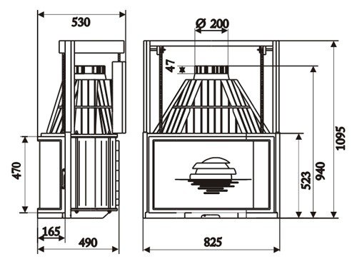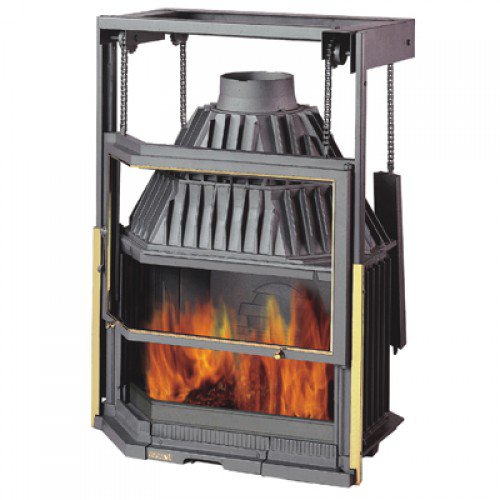 Левосторонняя чугунная топка для камина с увеличенным обзором огня. Регулировка закрытия, увеличенный дымосборник, боковое и вертикальное открывание дверцы и стеклом в форме призмы. Система подъема двери при помощи контргруза.