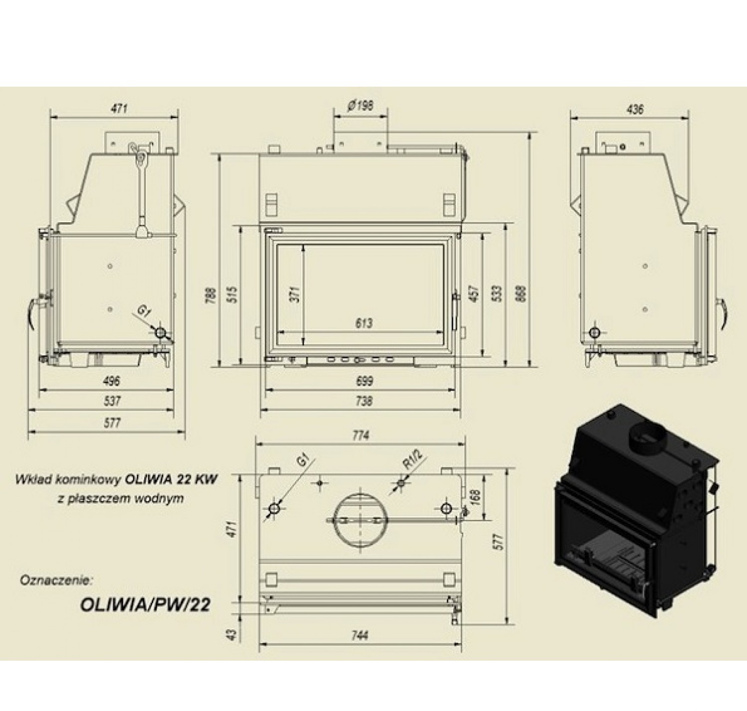 Каминная топка Oliwia/PW/22/GLASS с водяным контуром