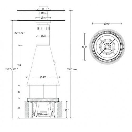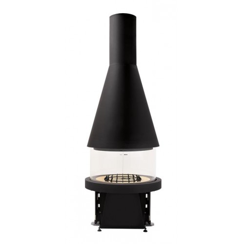 Круглый очаг, подъемная дверца с автоматической системой подъема и опусканий, панорамное стекло 360°.