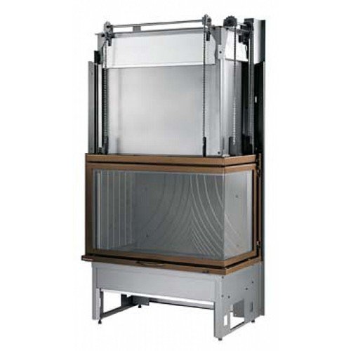 Пристенно-угловая модель топки для домашнего камина. Обзорное термостойкое стекло спереди и с правой боковой стороны. Система очистки стекла. Подъемный механизм двери. Для топки используются сухие дрова.