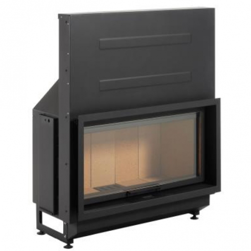 Каминная топка оборудована системами подачи внешнего воздуха для горения и системой самоочистки стекла, верхней подачи воздуха для горения(подовая топка).  Стенки топочной камеры облицованы шамотным камнем, для предотвращения прогорания корпуса и увеличиния срока службы прибора. Подьемный механизм двери, плавный и бесшумный, тросовый с использованием специальных подшипников качения. Вставка имеет регулируемые ножки для удобного монтажа.