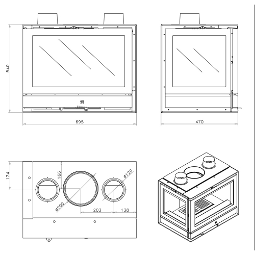 Пристенно-угловая топка с левосторонним открытием двери. Стальной корпус, внутренние стенки очага из вермикулита. За счет бокового стекла увеличивается обзор огня. Удобная загрузка топлива, простой уход и обслуживание, экономичный расход дров. На двери установлено жаропрочное стекло, выдерживающее высокую температуру. Выдвижной зольник облегчает обслуживание за прибором.