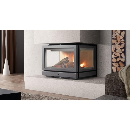 Достаточно мощная топка с корпусом из огнепрочной стали, задняя стенка очага из вермикулита. Широкая дверь упрощает процесс закладки дров. Трехсторонне остекление дает возможность контролировать процесс горения в топке с любого места каминной комнаты. Установленное стекло выдерживает температуру до +750 градусов. Представленная модель оборудована выдвижным зольным ящиком, что упрощает уход за печкой.