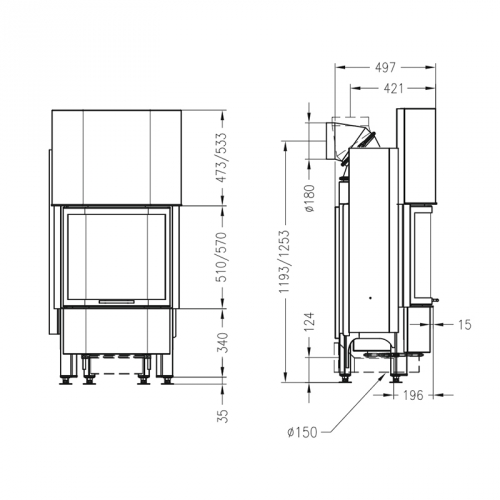 В топке имеется система длительного горения и система чистого стекла. Имеется возможность для подвода дополнительного воздуха из других помещений или улицы для процесса горения, что сводит к минимуму выжигание кислорода в помещении во время работы камина.