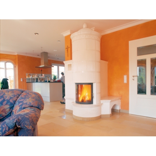 Каминная топка Spartherm Speedy R из стали толщиной 4/5 мм с антикоррозийным покрытием. Дверца с полукруглымм керамическим стеклом, которая открывается вбок. Шамотный кирпич внутри топки увеличивает температуру в топке, накапливает это тепло во время работы топки, и длительное время излучает его после окончания процесса горения.