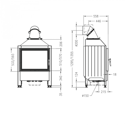 В топке имеется система длительного горения и система чистого стекла. Имеется возможность для подвода дополнительного воздуха из других помещений или улицы для процесса горения, что сводит к минимуму выжигание кислорода в помещении во время работы камина.