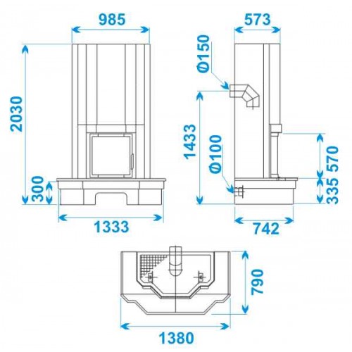 Основание камина выполнено из металлокерамики (огнестойкой стали с нанесением специальной мастики), а столешница и детали сопряжения с топочной камерой - из натурального гранита. Вытянутый прямоугольник конвекционной камеры имеет обтекаемые формы и сочетается с трехгранным стеклокерамическим окном топки и скругленным вырезом небольшой открытой дровницы.