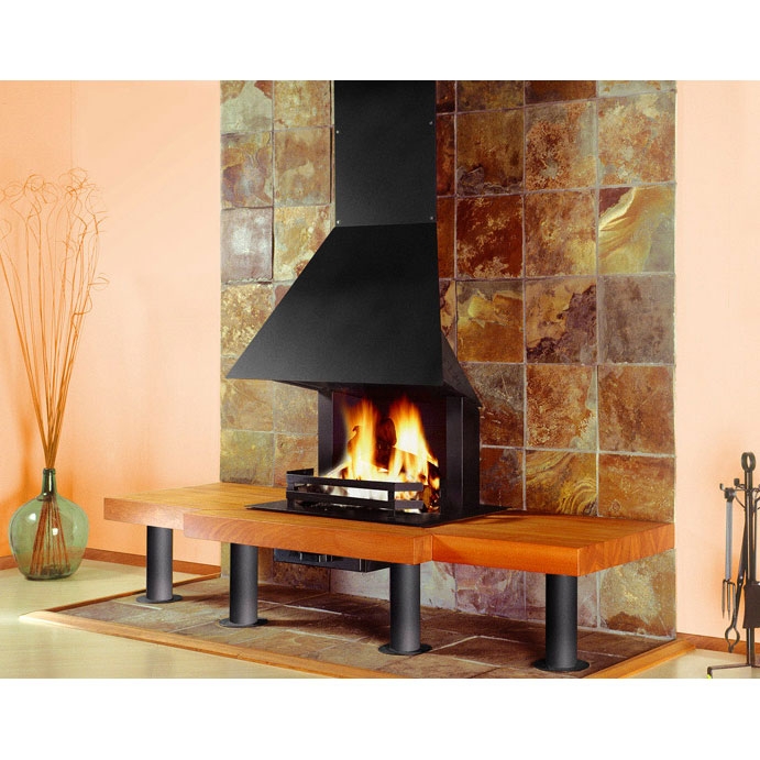 Фронтальный металлический камин с колосником и зольником, закрепленным на основании. Деревянная полка и металлические ножки. Задняя стена и напольное покрытие из сланца Pizarra со швом (30х30 см). Высота 2,60 м (диаметр дымохода 20 см).