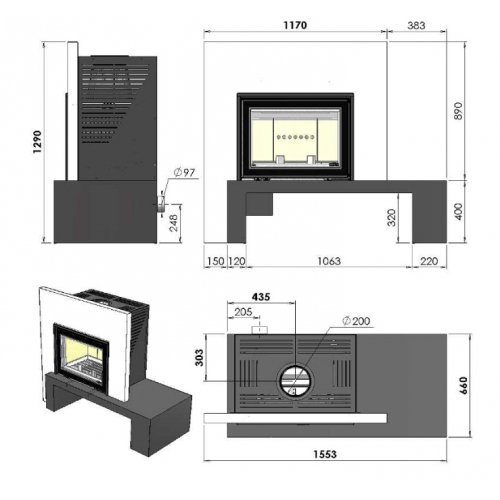 Металлический камин в стиле хай-тек. Асимметричная стальная белая рамка придает камину неповторимый стильный вид. Внизу расположена горизонтальная вместительная ниша для дров размером 106.3 x 70 x 30 см. Топка HP700 в комплекте.