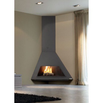 Угловой камин с двойной трубой, внутренняя труба O180 мм (не включена). Включает шибер и решетку. Со стеклом. Труба справа.