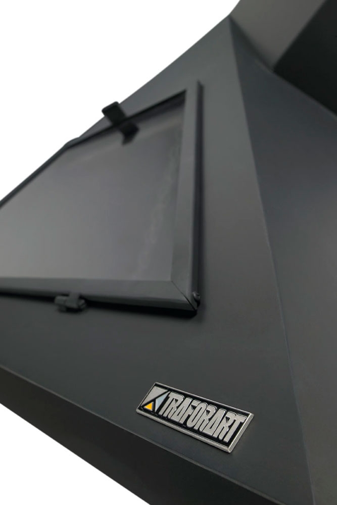 Фронтальный камин со стеклом. Вертикальная труба слева. Камин изготовлен из особой стали. Отделан огнеупорной черной краской, которая выдерживает температуру 650º.