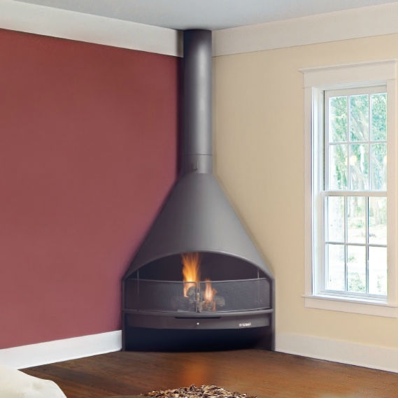 Угловой открытый закругленный камин. Камин изготовлен из специальной стали и отделан огнеупорной черной краской (выдерживает 650°). 2 сегмента трубы по 1 м входят в комплект.