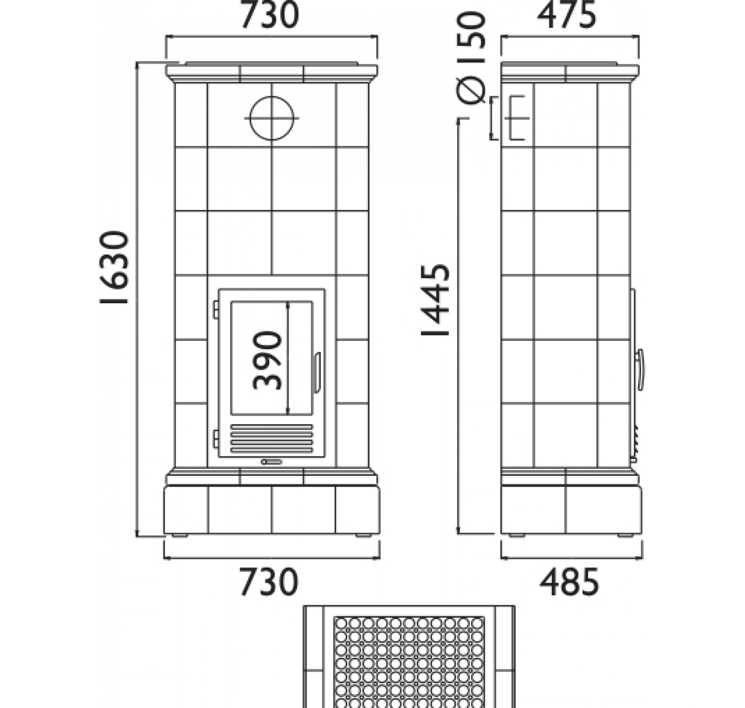 Обратите внимание на высоту печи — 1 м 63 см, она значительно выше стандартных размеров. Печь производится с различными вариантами кафеля для облицовки.