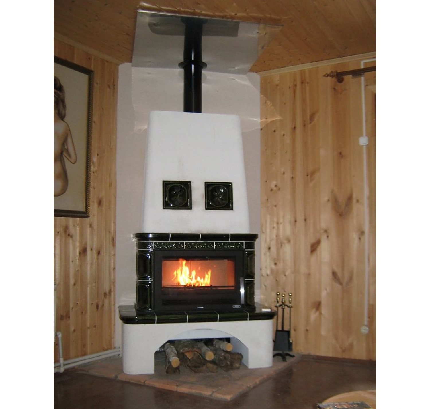 Для облицовки печи применяется печной кафель, который является наилучшем накопителем тепла, он быстро нагревается и очень долго остывает. Поэтому после прогорания дров Ваш дом будет обогреваться за счет отдаваемого тепла облицовки еще на протяжение 5–6 часов. За час печь в номинальном режиме расходует 3,2 кг сухих дров.