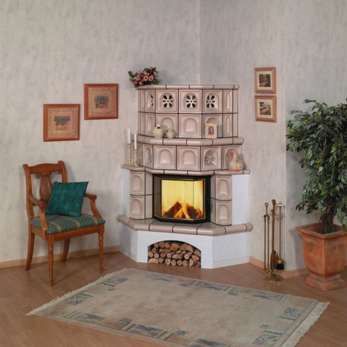 Декоративный угловой камин - отличный выбор для загородного дома или городской квартиры. Облицовка из рельефных изразцов ручной работы придают камину неповторимость и индивидуальность. Топка с призматической стеклянной дверцей. Вместительная дровница.