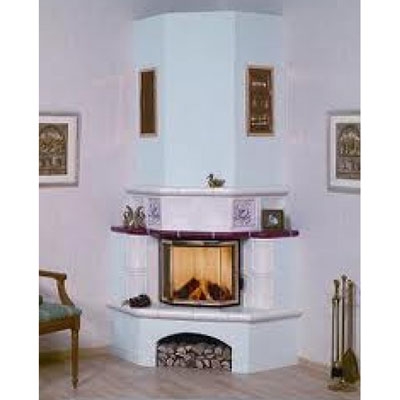 Каминная конструкция оригинального дизайна, облицованная изразцами ручной работы. Призматическое стекло топки дает возможность контролировать процесс горения. Вместительная ниша для дров.
