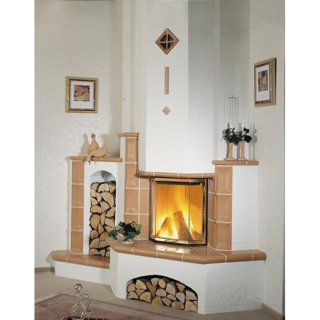 Камин с облицовкой из глазурованных изразцов. Эркерное стекло топки дает возможность любоваться огнем и наслаждаться теплом. С боковой стороны портала расположена вертикальная дровница, внизу - дополнительная ниша для дров. Цвет изразцов - 251.