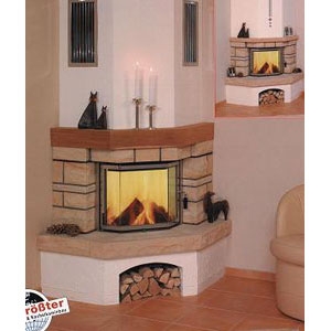 Угловой камин из натурального камня Sandstein bossiert + деревянная балка.