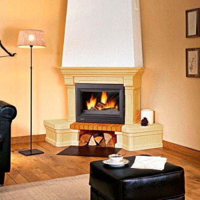Угловой камин из золотисто-песочного камня Edelroc с топочной плитой из кирпича.