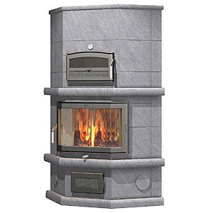 Верхнее подключение дымохода. Угловая печь-камин с духовкой. 3 тепловой класс.
