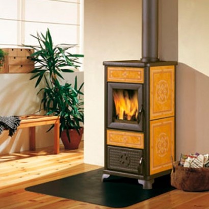 Отопительная печь. Корпус отопительной печи - сталь, внутри - чугун, вставки из керамики, съемные кольца конфорки на варочной поверхности.