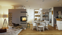 Дровяной камин в современном стиле состоит из очага с дымоходом, отвечающим за тягу и отвод наружу продукты горения, а также топки, где сгорает топливо (поленья, пеллеты или уголь).